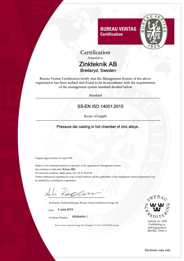 I vår produktion har vi ingen isolerad kvalitetsavdelning. Kvalitet och medvetenhet är aspekter vi applicerar i varje steg vi tar, som en vital del när det gäller både organisation och produktion. I vår strävan att nå Zero defect måste vi jobba med varje steg i produktframtagning och alla produktionsprocesser. Skulle det inte var tillräckligt säkert kan vi dessutom använda oss av 100% detaljkontroll med vision system. Zinkteknik är certifierade enligt ISO 9001 och IATF 16949.
