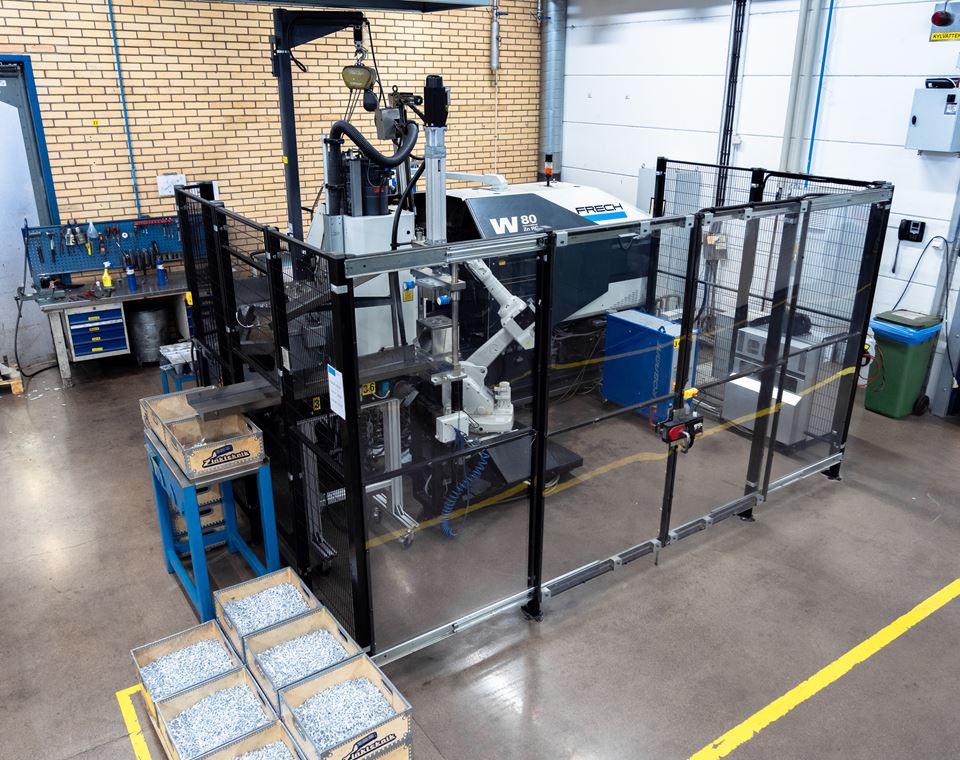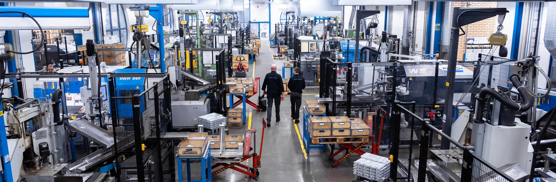 När vi gjuter använder vi oss av en varmkammarmaskin. Maskinen är optimal för effektiv och precisionssäker produktion. Vi har 65 gjutmaskinceller i vår maskinpark med integrerade robotceller och processövervakning. Det möjliggör en säker process, hög produktionstakt och stor flexibilitet.